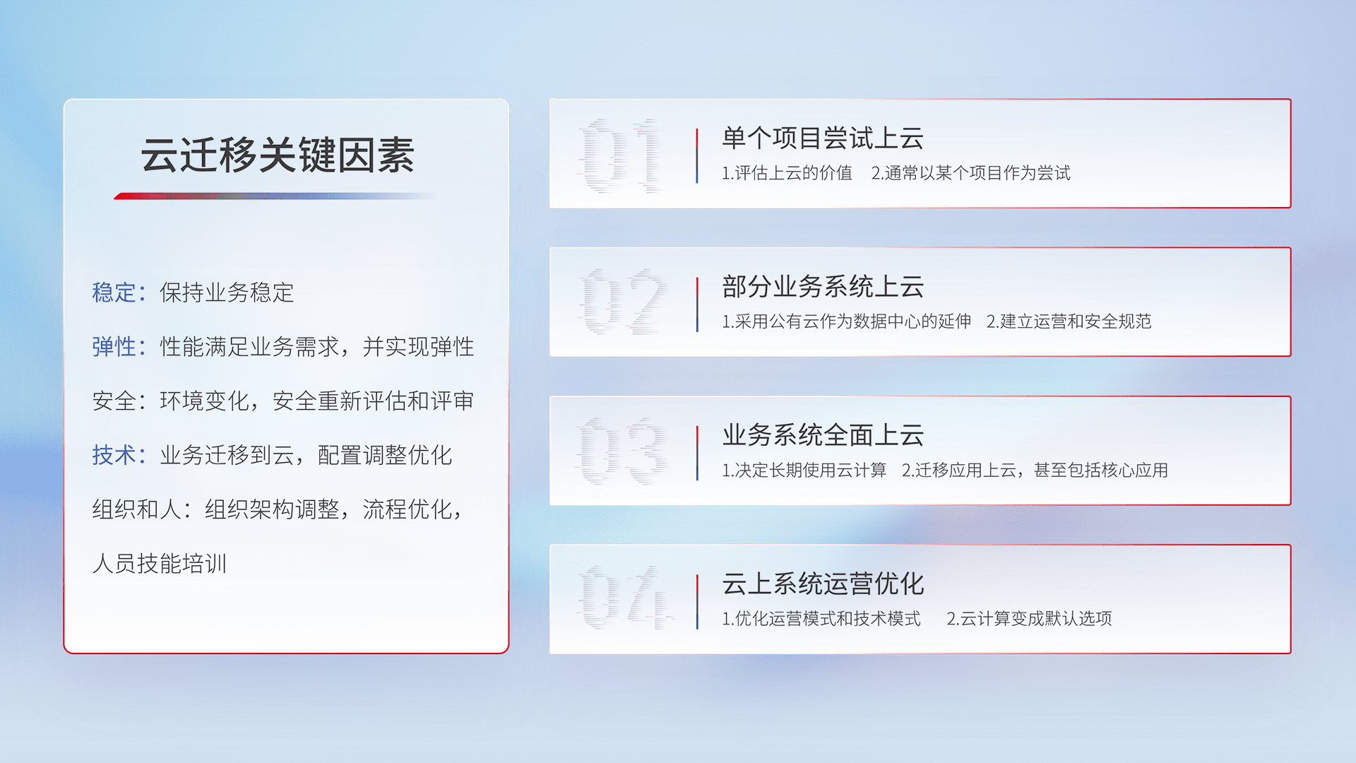 结合实际业务,,,从规划设计、、、、云平台选型、、云原生改造、、数据迁移、、集成交付,,,迁移全过程为客户识别最佳上云路径,,,做好风险识别管理,,设计网络架构、、、、身份权限、、、、安全审计合规、、操作审计、、日志审计、、、、监控告警策略、、、多站点容灾设计等,,,,对云上基础设施进行整体规划,,,提升IT治理水平,,,,以满足弹性、、高可用、、高性能的需求。。