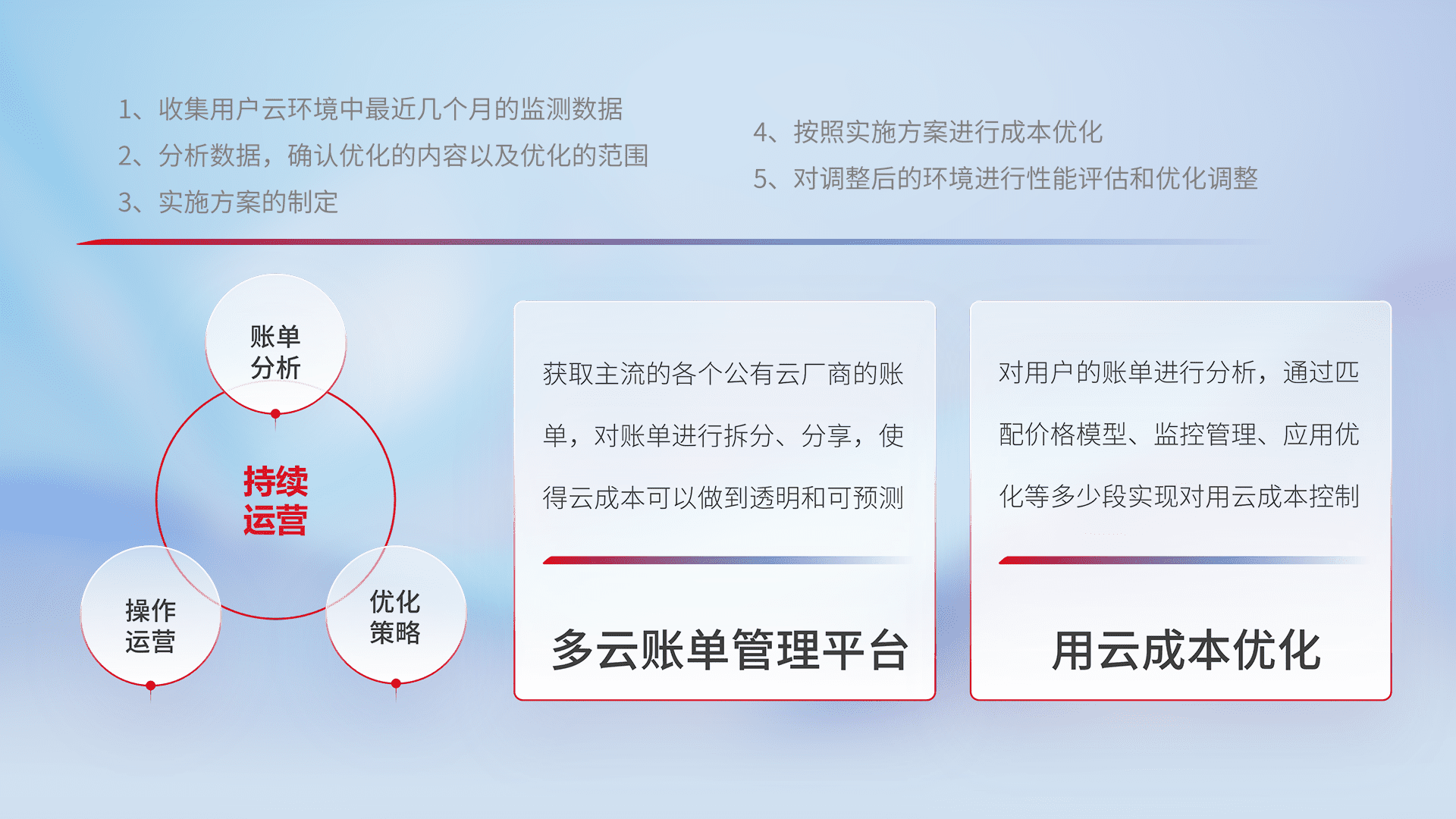 通过多云纳管,,,以统一的资源数据模型把客户的云资源进行抽象和封装,,进而实现对多云资源的统一操作,,保障云资源管理的可靠性、、、、稳定性与可用性。。。量身定制化运维内容,,配置、、、开发运维、、、补丁管理、、、、备份、、、监控、、、认证和访问管理、、、审计和日常巡检等,,保障在用云过程中的可靠度,,稳定度以及高可用率。。。