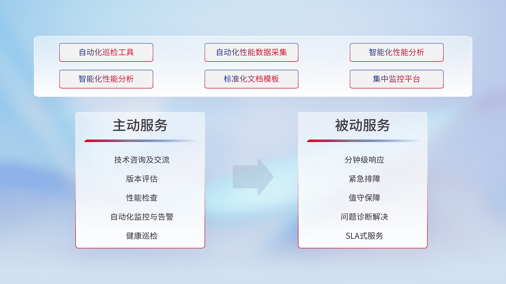 智能化工具和标准化文档,,,保障服务质量,,,,提供主动服务(包含技术咨询、、、、版本评估、、、性能检查、、、、自动化监控与告警、、、、健康巡检)和被动服务包含(分钟级响应、、、紧急排障、、、值守保障、、、问题诊断解决、、、、SLA服务)。。。